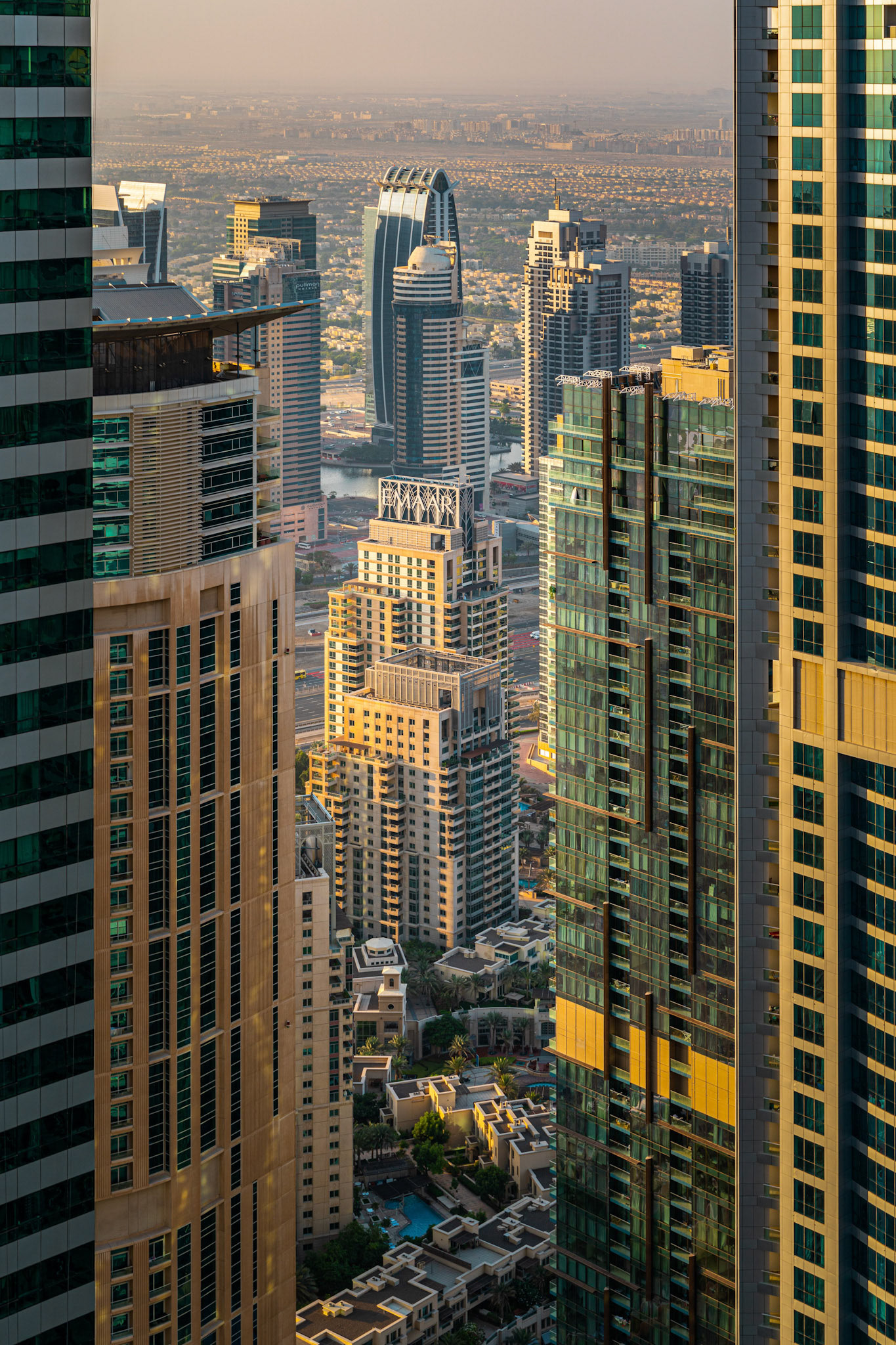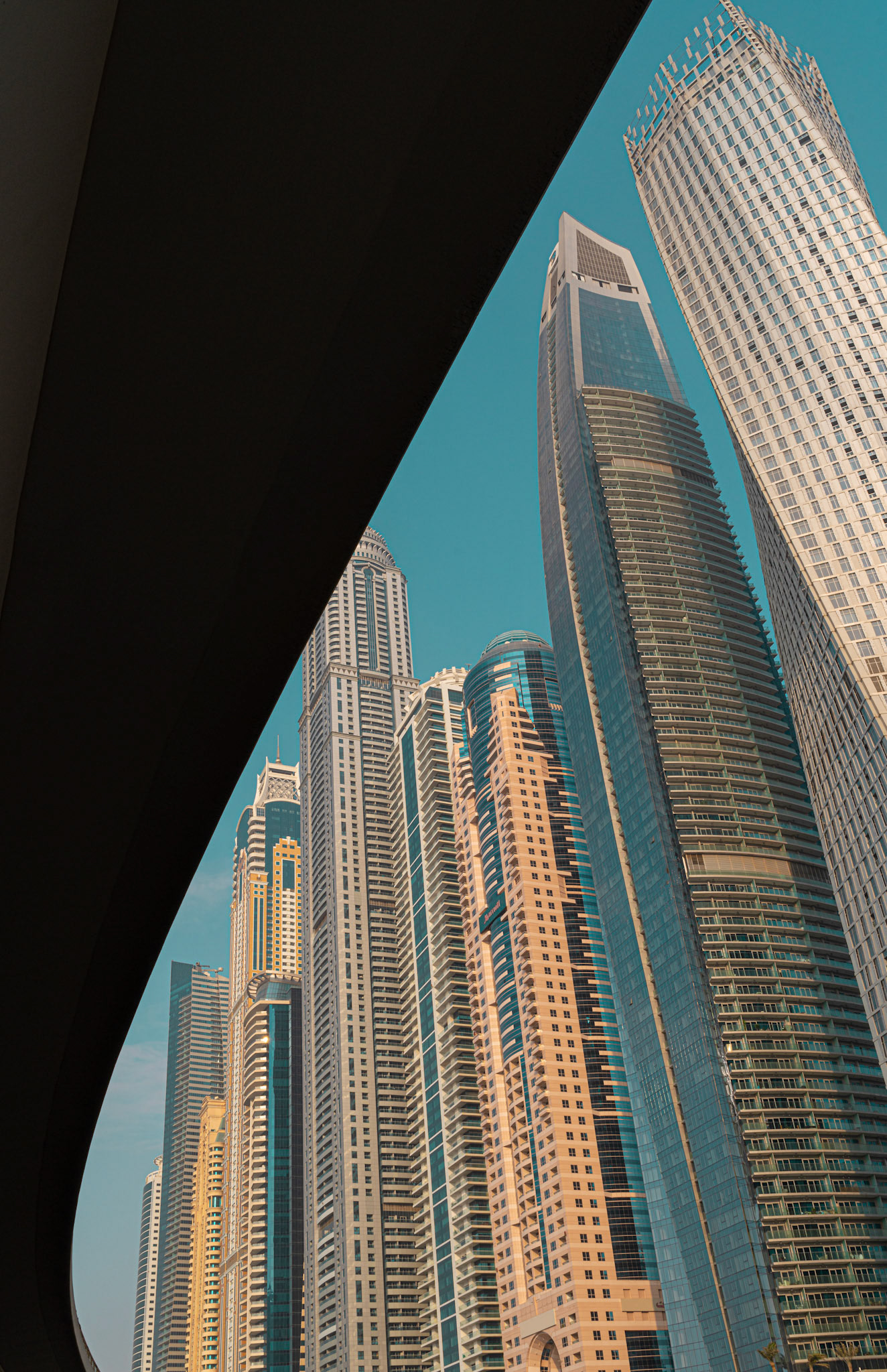 Black white detail pictures of a bridge in Dubai. Skyscraper in the background. Al Kazim Towers in the background.